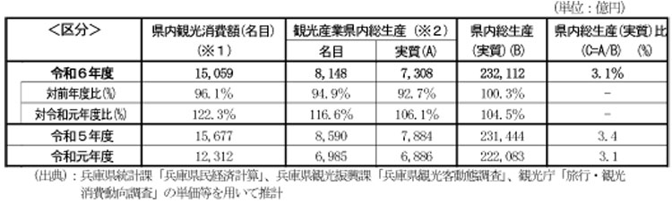 前年度は「ひょうごを旅しようキャンペーン」(全国旅行支援)などコロナ特需と言えるような特殊 事情により観光消費額が大幅に増加したことから、令和6年度は前年度を下回ったものの、令和元年度