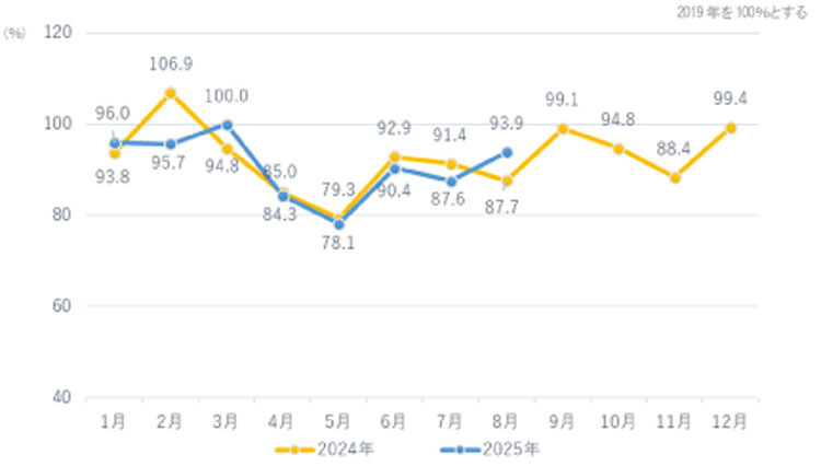2024(R6)年の主要観光施設における観光入込客数の2019年同月比は、2月は2019年を上回ったものの低 調な傾向にあり、2025(R7)年も2024(R6)年同様に推移している。